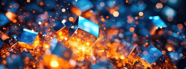 Abstract scene featuring many translucent orange cubes and particles floating against a dark background with sharp blue illuminated geometric shapes creating a dynamic, modern pattern