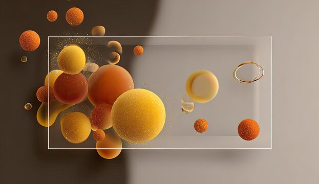 Abstract digital composition with floating spheres and a clear rectangular shape