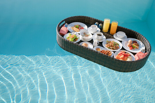 Breakfast in swimming pool, floating breakfast set in tray in resort.