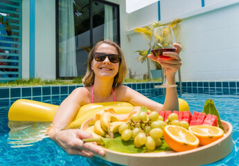 Breakfast tray in swimming pool, floating breakfast in luxury hotel. Girl relaxing in the pool drinking smoothies and eating fruit plate, smoothie bowl by the hotel pool. Exotic summer diet. Tropical