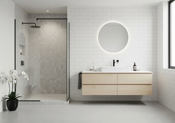 Luxury minimalist bathroom design featuring floating wood vanity and walk in shower