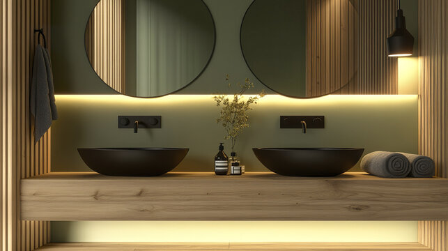 A lovely bathroom featuring a floating wood cabinet marble countertop and gold circular mirror With copyspace for text