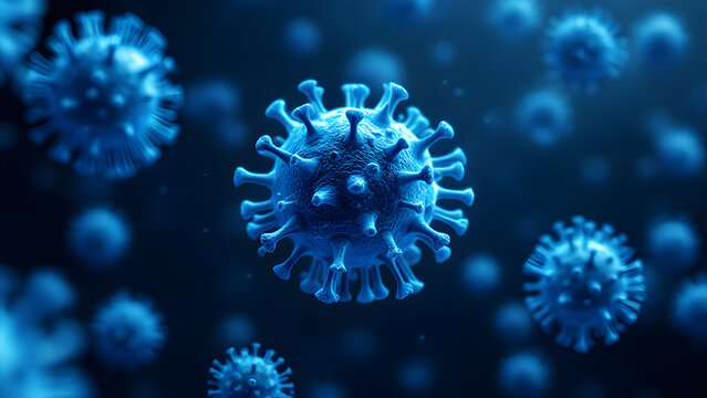 Scientific depiction of virus particles, showcasing their spiked outer membrane, floating in a dark space.
