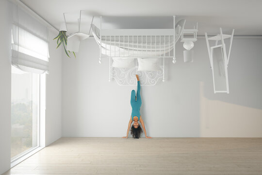 Woman doing a headstand in an upside down bedroom