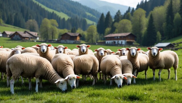 A serene flock of sheep grazing in a lush green meadow surrounded by mountains and forest with rustic houses in the background.