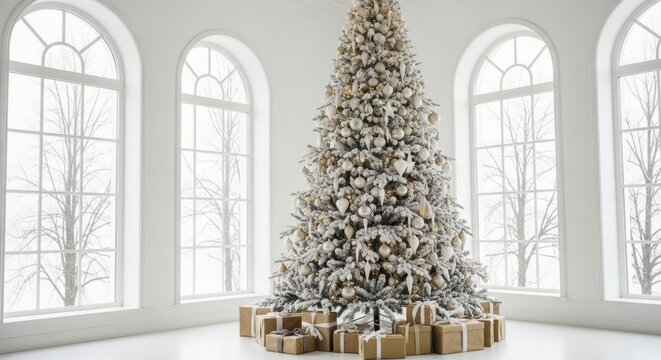 Elegant flocked Christmas tree adorned with shimmering ornaments and presents in a bright white room with arched windows