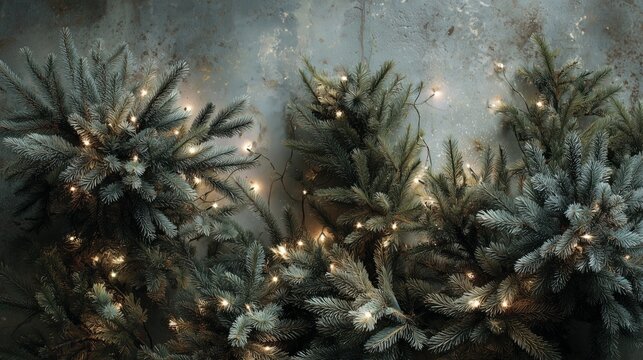 A pine tree branch covered in white snow, creating a wintery backdrop, background, wallpaper, copy space