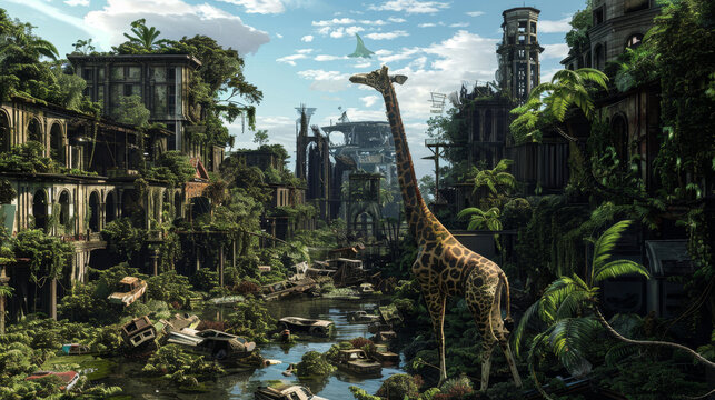 A giraffe standing in a flooded city overgrown with lush vegetation, symbolizing the resilience of nature, the impact of climate change, the contrast between nature and civilization