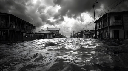 Commercial Catastrophe: Capture a flooded downtown, water reaching the windows of businesses, and street signs peeking through, highlighting economic impact