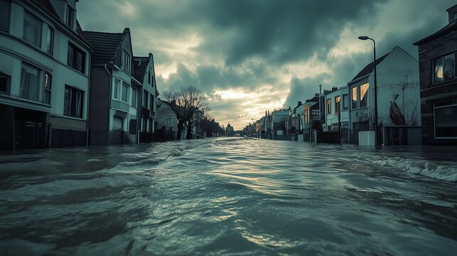Flooded street in a residential area during an overcast evening, highlighting the impact of heavy rainfall on the neighborhood