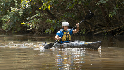 Kayaker navigating a flooded forest as sunlight reflects off still, muddy water