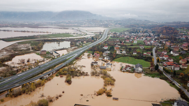 Aerial drone view of torrential rain causes flash floods in residential areas. Houses and roads surrounded by water. Climate change. Heavy rainfall consequences.