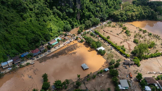 Aerial view of people evacuate from their village after Kok river flood and rising after heavy rain. Chiang Rai hit by flash floods and runoff after overnight rain.