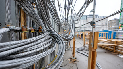 Pile of cables on floor in new building. Electricity installation and interior renovation. Closeup.