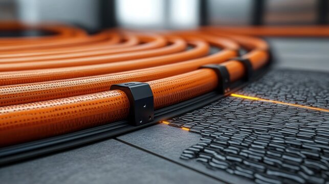 Close-up of modern electrical conduits showcasing energy-efficient heat distribution technology in sustainable underfloor heating systems