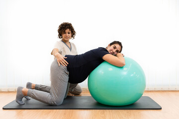 A pregnant woman doing pilates exercises with a ball with the help of her physiotherapist