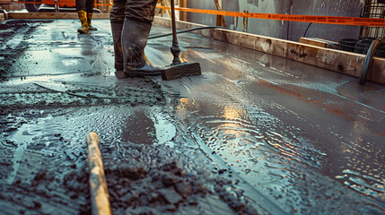 A construction worker, wearing gloves and boots, meticulously spreads fresh concrete screed across a floor using a long leveling tool, signifying the process of floor preparation and construction work