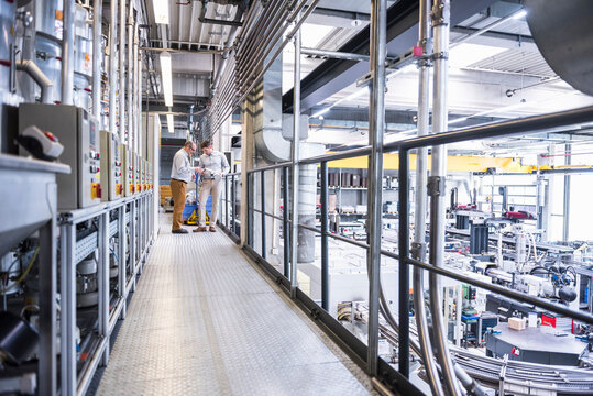 Diverse coworkers descending industrial staircase holding rail carrying bag and folder