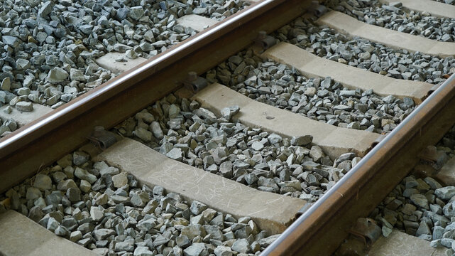 Deserted empty Train Platform Perspective with a bench. Outdoor Train station, platform and tracks, floor brace stoppers.