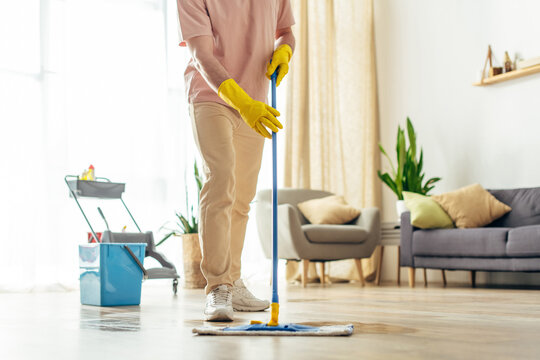 Male hant hold plastic mop and wash dirty ploor closeup background. Professional cleaning concept