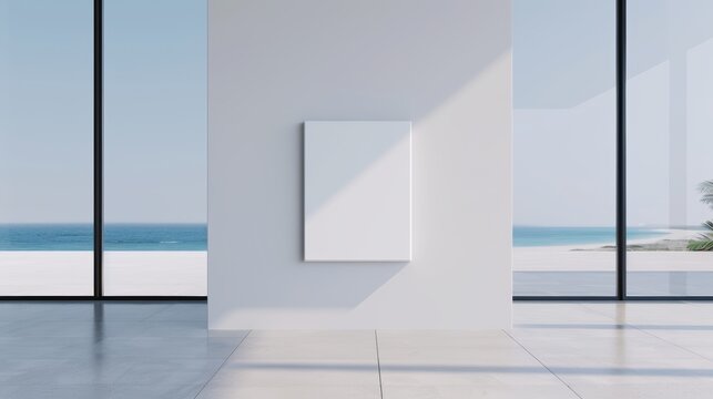 A minimalist white control panel in a modern home, with floor-to-ceiling windows showcasing a tranquil beach scene