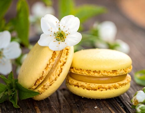Showcasing assorted croissants and colorful macarons on rustic wooden tabletop flatlay