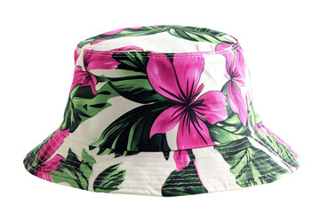 A white bucket hat with a tropical print featuring pink flowers and green leaves.