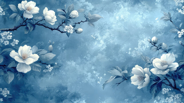 Floral pattern with motion on blue background featuring copy space