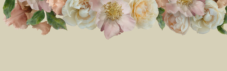 White roses, pink peony and iris isolated on pastel yellow background. Border floral banner, cover, header with copy space. Natural flowers wallpaper or greeting card.