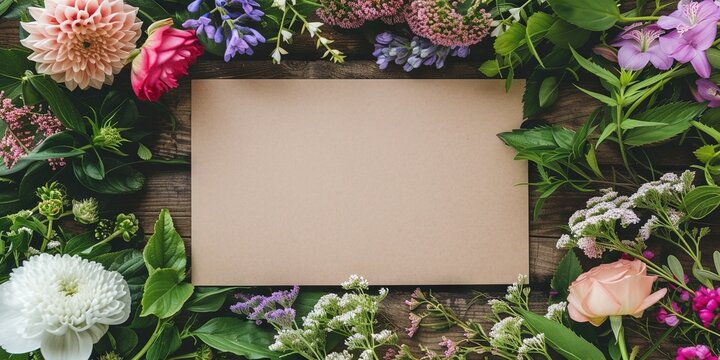 Flowers surrounding a blank card template for holidays, anniversaries, and weddings with floral arrangement