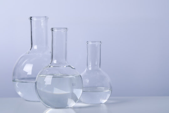 Glass beakers filled with light blue liquid. Different laboratory glassware. Isolated on white background