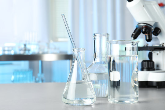 Chemical glassware with blue liquids and test tubes on table in Laboratory