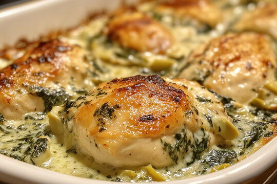 Creamy chicken Florentine pasta with sautéed spinach and grilled chicken strips, garnished with fresh basil and grated Parmesan, served on a rustic ceramic plate in warm natural light