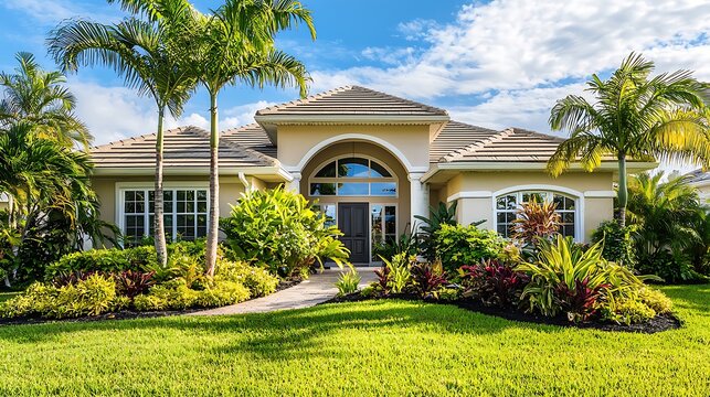 Facade of a beautiful house with a front garden of palm trees, short grass and tropical plants