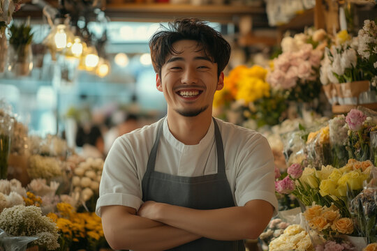 Smiling florist holding fresh sunflower bouquet in flower shop