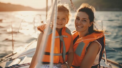 Portrait of a little girl with lifejacket on deck of a yacht in sea.