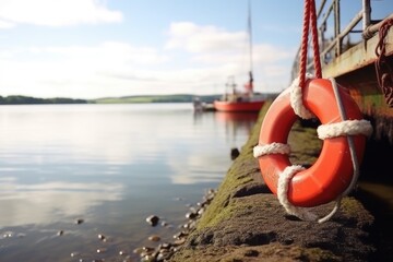 Nautical safety equipment, red white lifebuoy suspended against weathered blue wooden background, signaling maritime rescue readiness