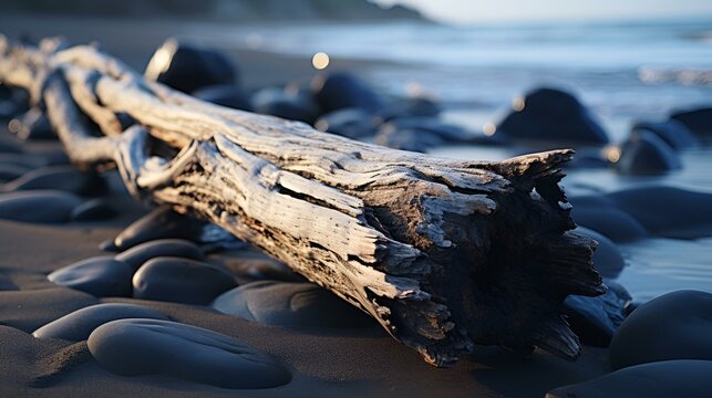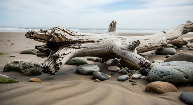 Driftwood on a Sandy Beach with Smooth Stones and Ocean Waves.