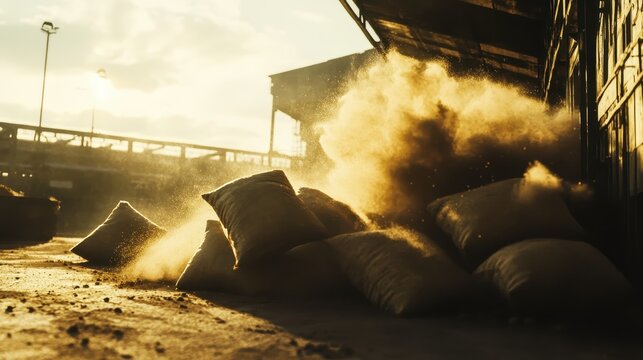 Overturned sacks of industrial powder creating a dusty cloud in bright sunlight at a storage facility