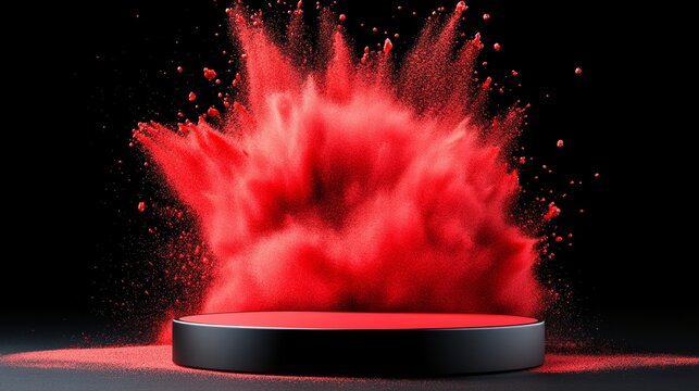A red and white powder cloud is erupting from a black and red box. The box is a small, circular platform with a red base and a black top