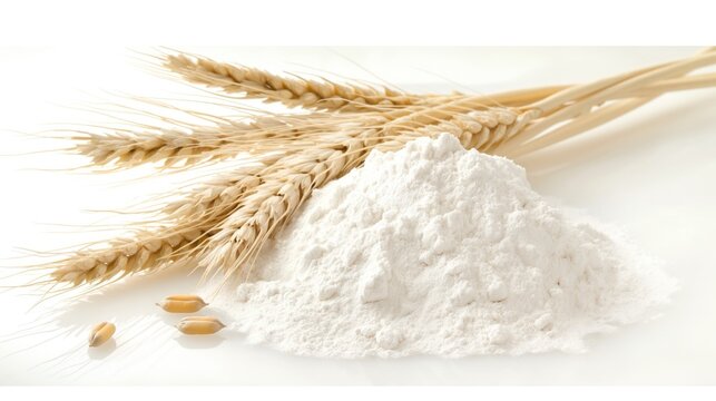 Fresh flour and ears of wheat isolated on white background. Dry wheat ears and flour pile. Natural ingredients for baking and cooking. Gluten-free and healthy food for vegan and vegetarian diets.