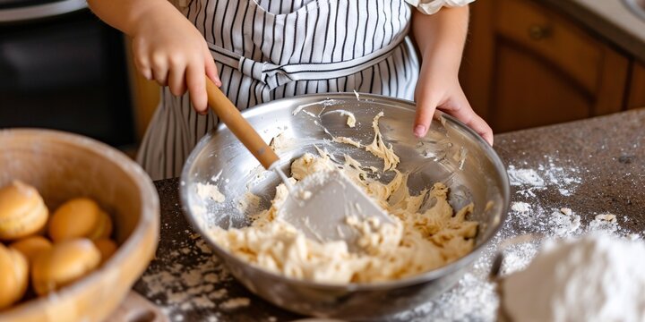 A young woman is using a large spoon to combine ingredients for macaroons in a metallic mixing bowl.