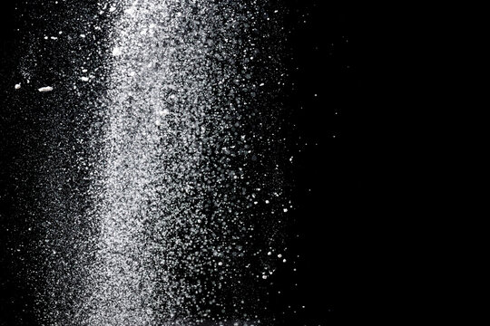 White powder explosion. White powder splash isolated on black background. Flour sifting on a dark background. Explosive powder white