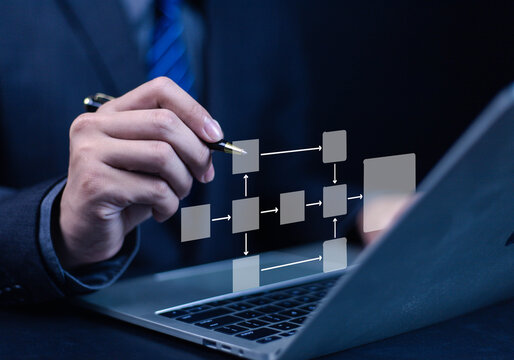 workflow process, programming to streamline strategy, and implement software. Concept of design for automation flowchart of business, model flow diagram of work. Scheme chart of the solution business