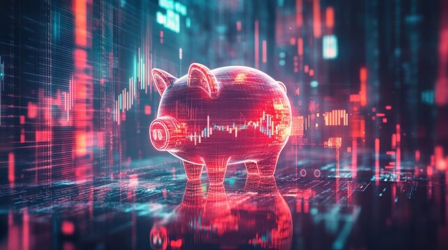 Creative depiction of a digital piggy bank showcasing a futuristic financial concept with vibrant colors and patterns