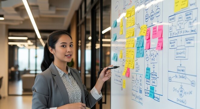 Female project leader drawing flowchart on whiteboard and talking to sitting coworkers. Business colleagues in casual working together in contemporary office space. Leadership concept