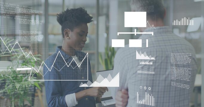 Business colleagues discussing analytics dashboard on glass partition with data overlay