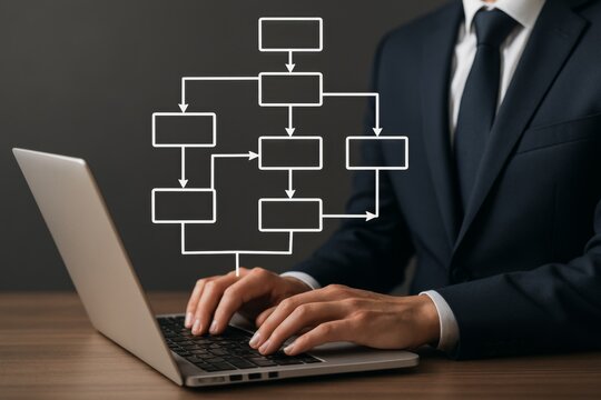 Digital Workflow Management Concept, A person is working on laptop with illuminated hands on the keyboard, flowchart elements representing workflow automation, process mapping, digital system design.