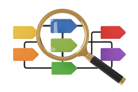 Magnifying glass examining a 3D colorful flowchart diagram with multiple interconnected arrow-shaped steps, symbolizing process analysis and visualization. background removed