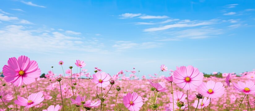 Beautiful panoramic natural landscape of a green field with grass against a blue sky with sun. Spring summer blurred background.